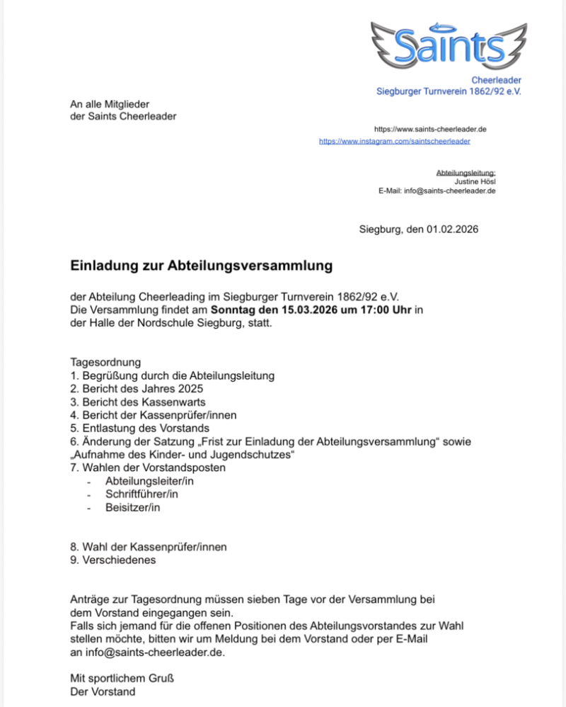 Die Versammlung findet am Sonntag den 15.03.2026 um 17:00 Uhr in der Halle der Nordschule Sigburg statt.